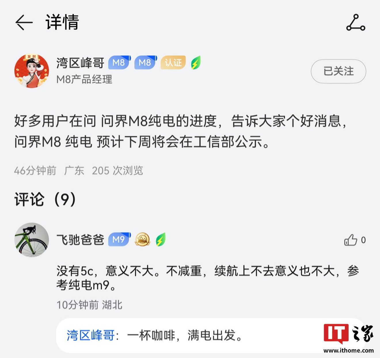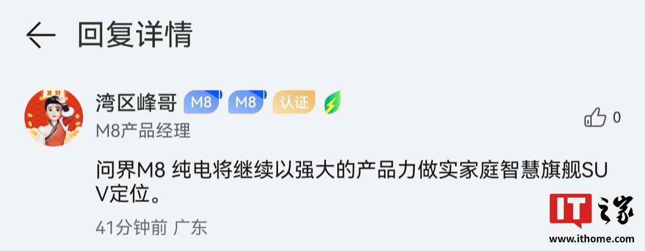 有用户提出质疑,称“没有 5C 意义不大”,他回复:“一杯咖啡,满电出发。”另外,该产品经理还表示,“问界 M8 纯电将继续以强大的产品力做实家庭智慧旗舰 SUV 定位”。